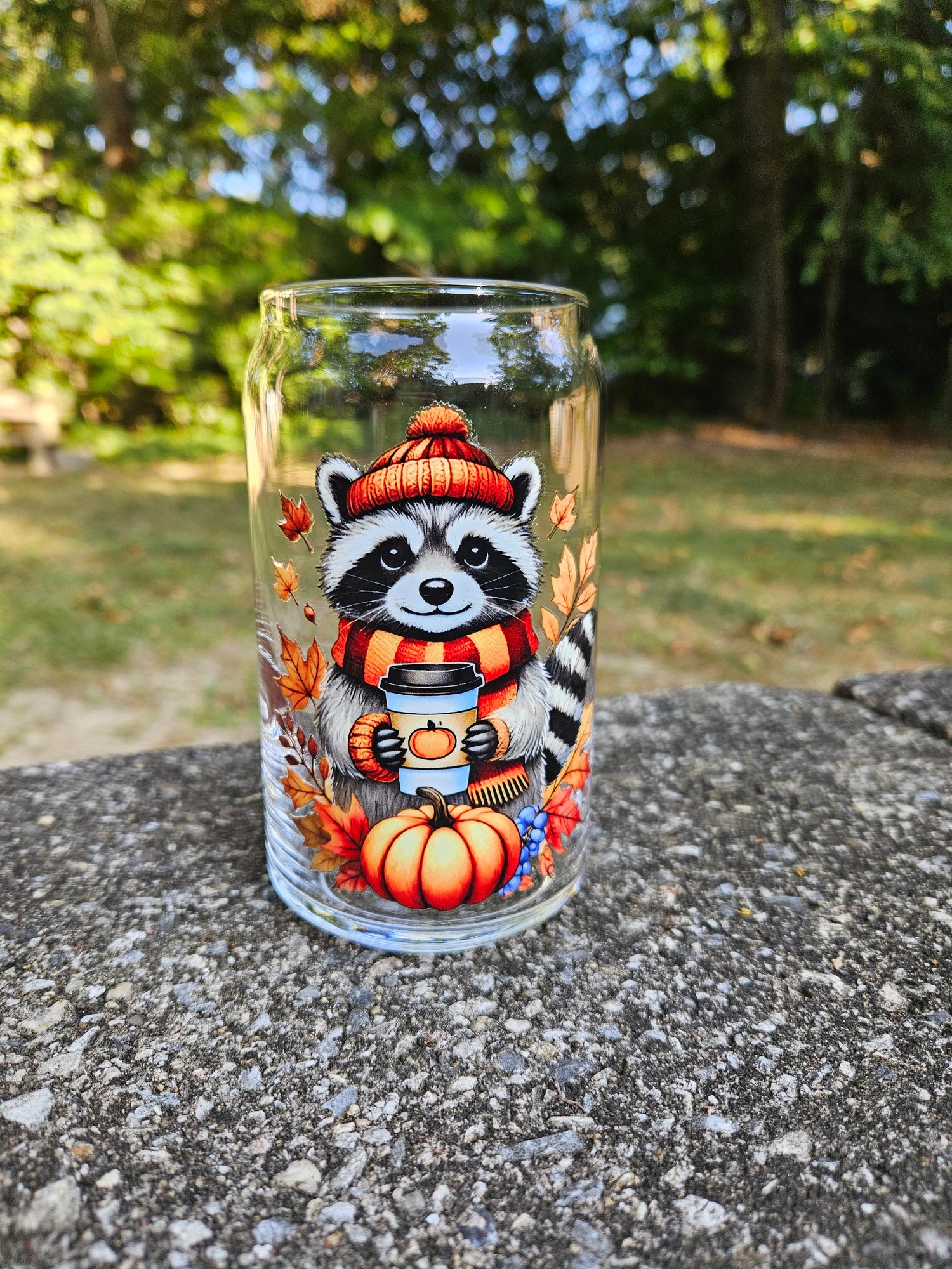 Get cozy with this cutie. Autumn Raccoon can glass.