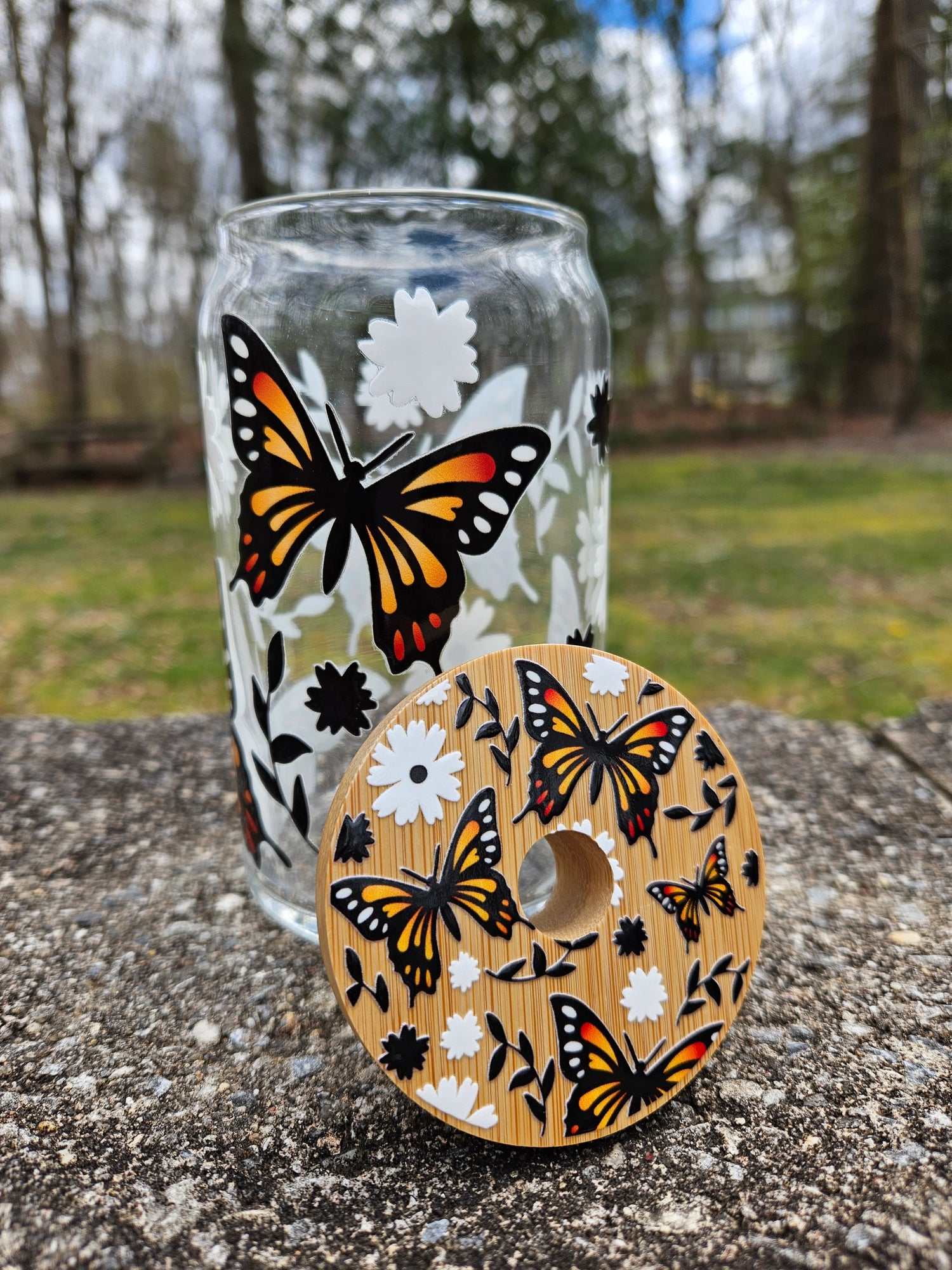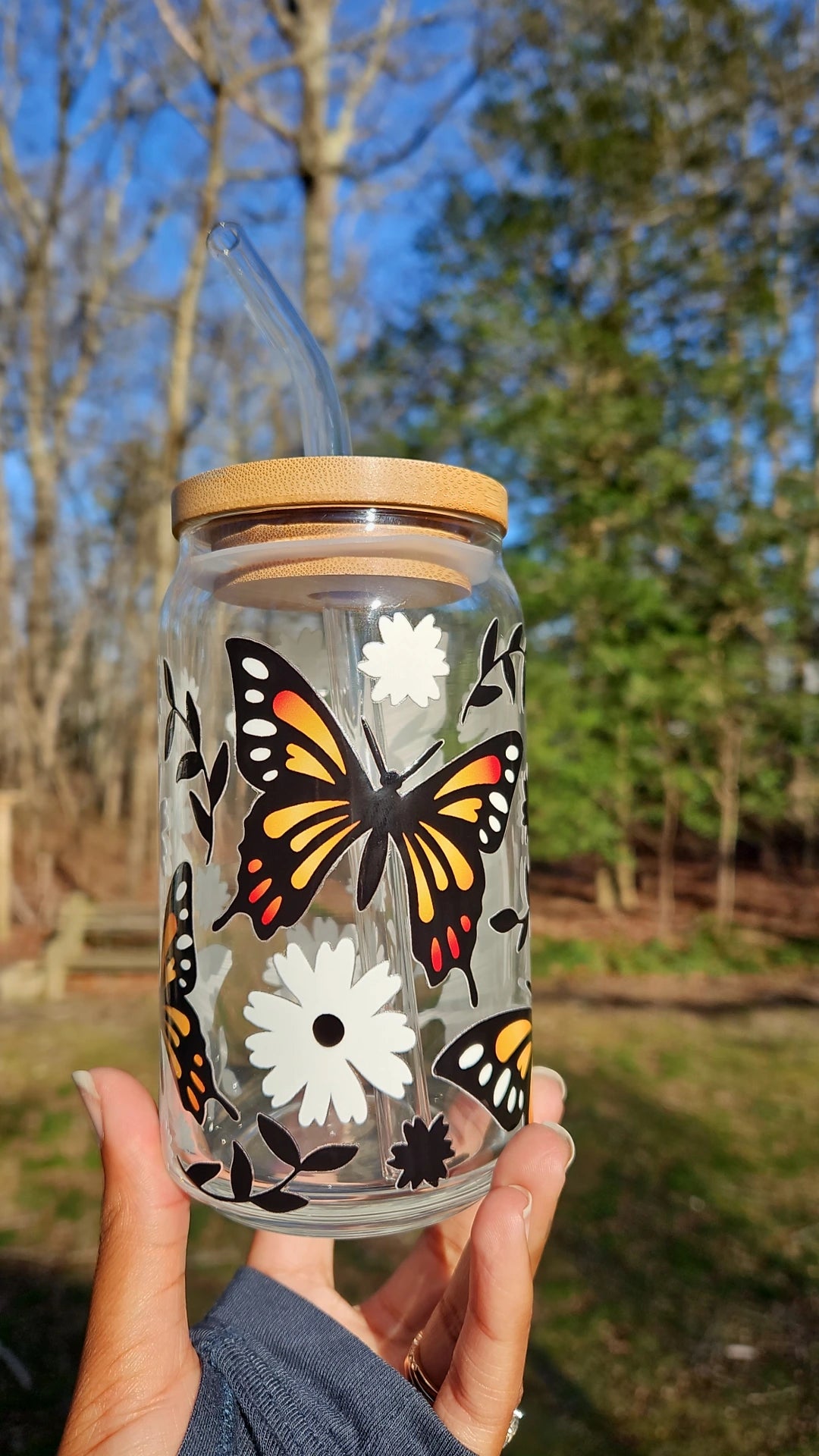 Welcome Spring with this cute butterfly can glass. Perfect glass for hot and cold drinks!
