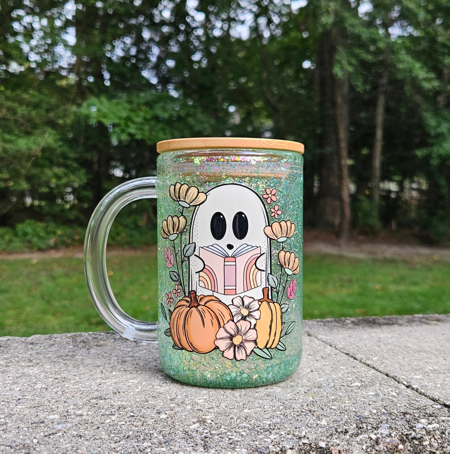 Embrace the spooky season with our 15oz Reading Ghost glitter glass mug! This mug is perfect for sipping your favorite hot or cold beverages while adding a touch of Halloween charm to your day. The glitter finish adds a fun sparkle, making it an eye-catching addition to your kitchen or a great gift for fellow ghost enthusiasts. Whether you're enjoying a cozy night in or hosting a Halloween party, this mug is sure to bring a smile to your face!