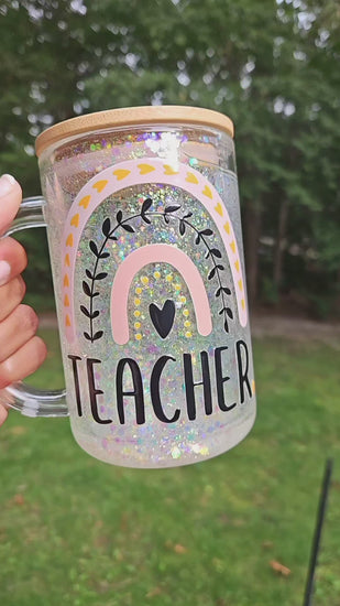 Brighten up your mornings with our 15oz Teacher glitter globe glass mug! This stunning glass mug features a vibrant rainbow design adorned with sparkling glitter, making it the perfect companion for your favorite hot or cold beverages. Whether you're sipping coffee during a busy school day or enjoying tea while grading papers, this mug adds a touch of fun and flair to your routine. Show off your love for teaching and let your personality shine with every sip!